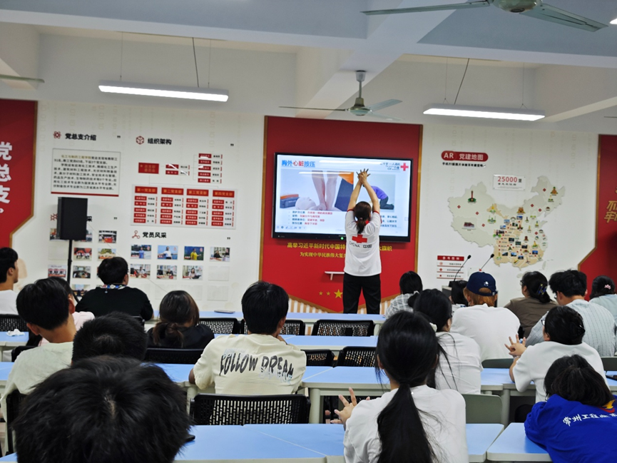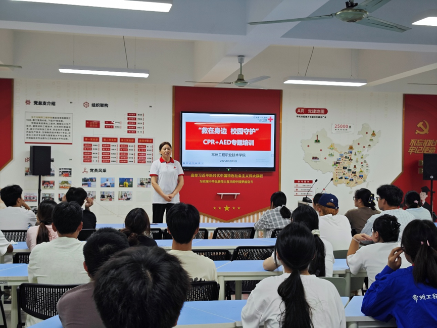 本次培训以“救在身边,校园守护”为主题,邀请常州市红十字会应急救护培训讲师开展培训。培训以“理论讲解+实操演练+模拟考核”的形式展开,严格遵循红十字应急救护培训标准体系 。红十字会的讲师们从红十字运动起源与应急救护概论切入,结合真实案例讲解了“黄金4-6分钟”在急救中的关键意义。在理论授课环节,讲师们重点解析了心肺复苏(CPR)操作流程、自动体外除颤器(AED)使用原理等核心内容 ,并通过视频演示与互动问答,让抽象的医学知识变得通俗易懂。